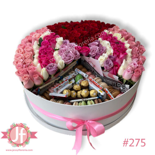 Caja circular de 100 rosas rojas y 2 varas de orquídeas