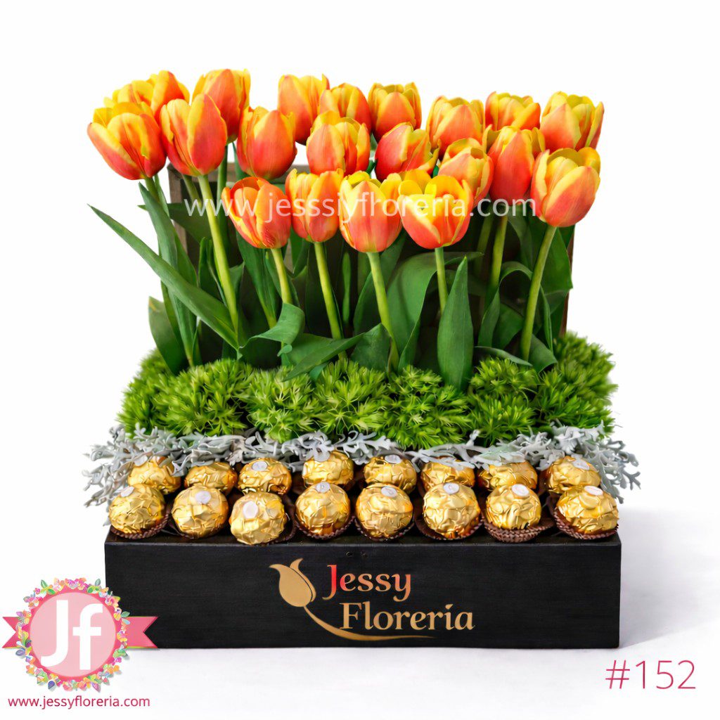 Sugerencia de mensaje para Cofre de tulipanes con ferreros: “Sonidos raros, miradas, sonrisas, besos y abrazos. Así hablamos tú y yo”