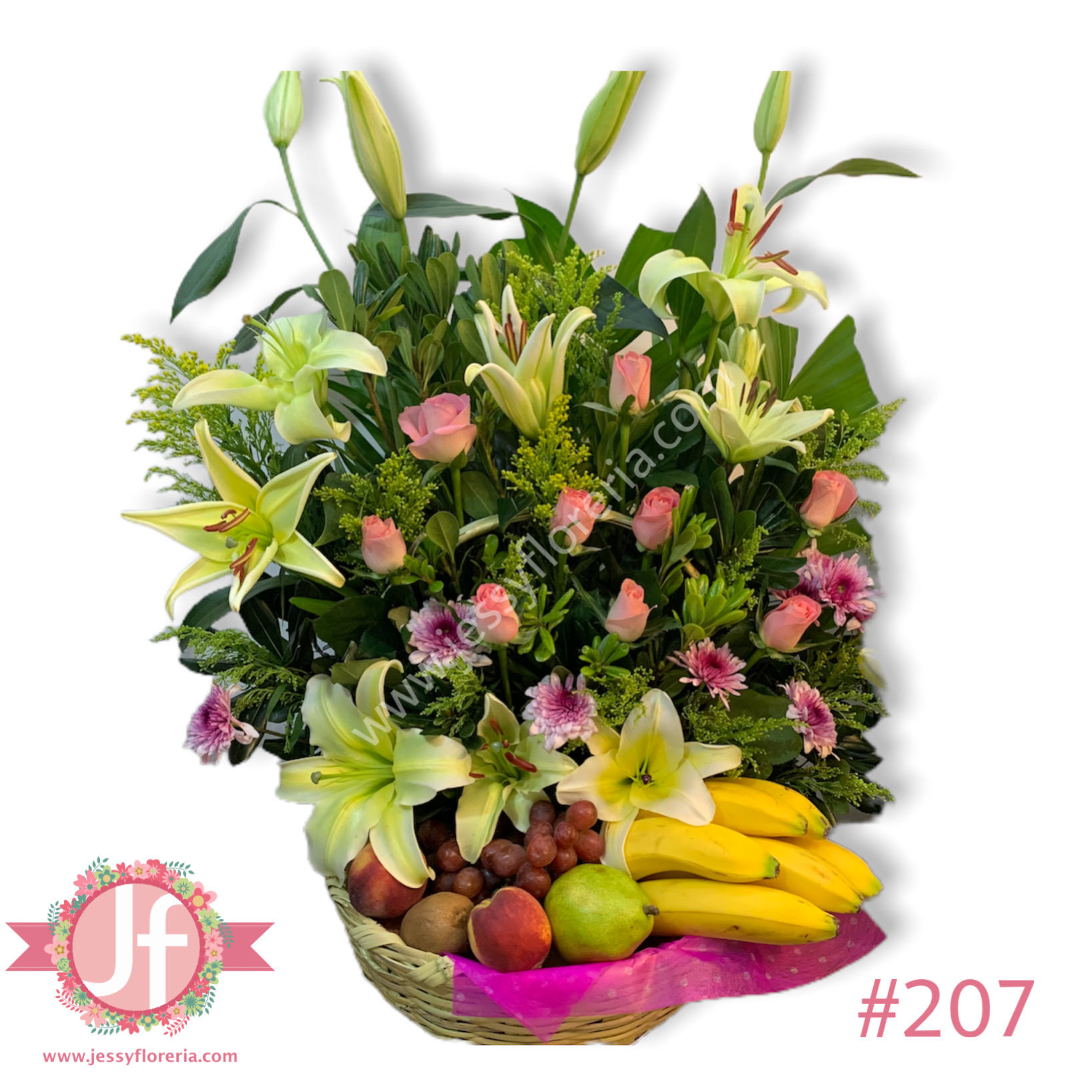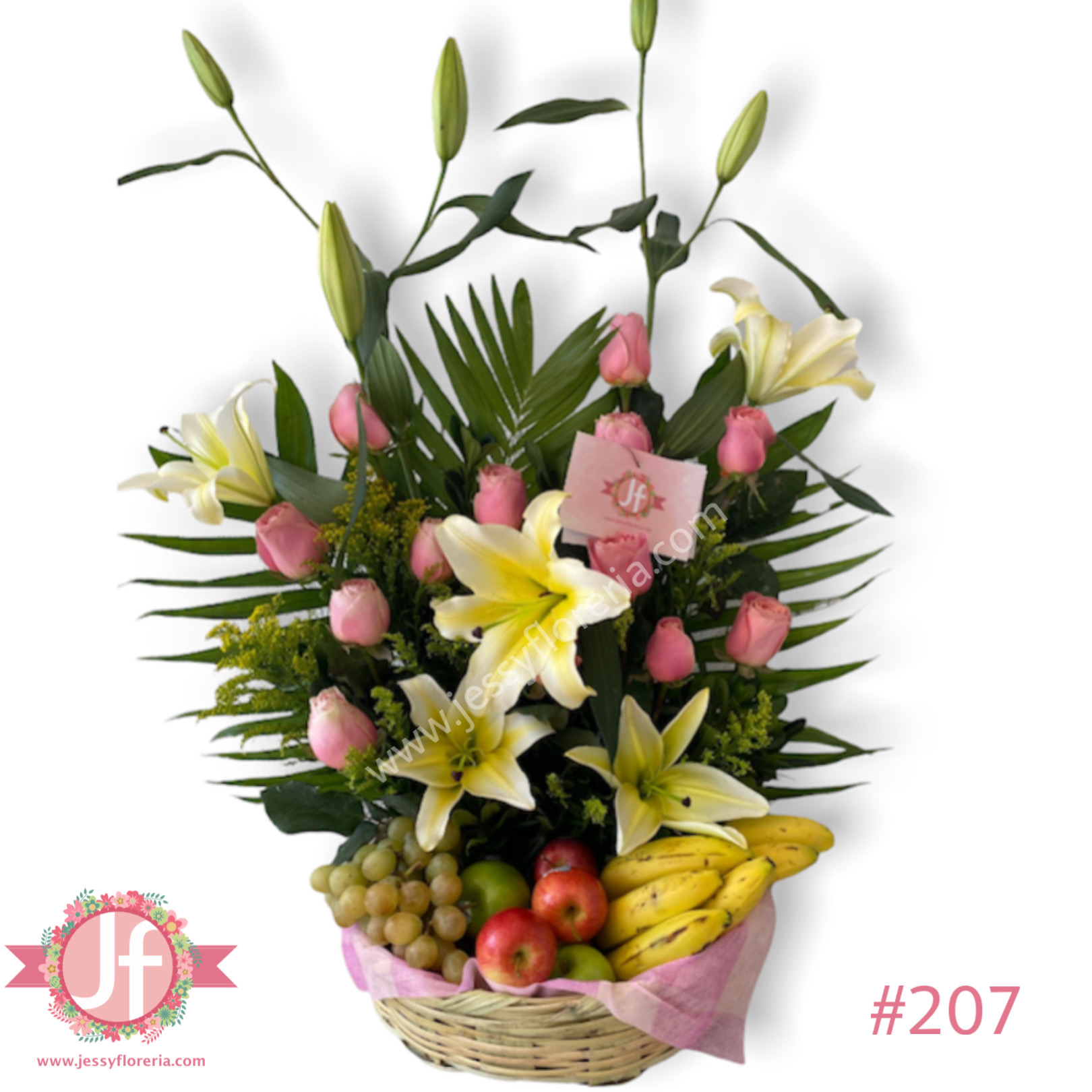 Canasta frutal con rosas y concador