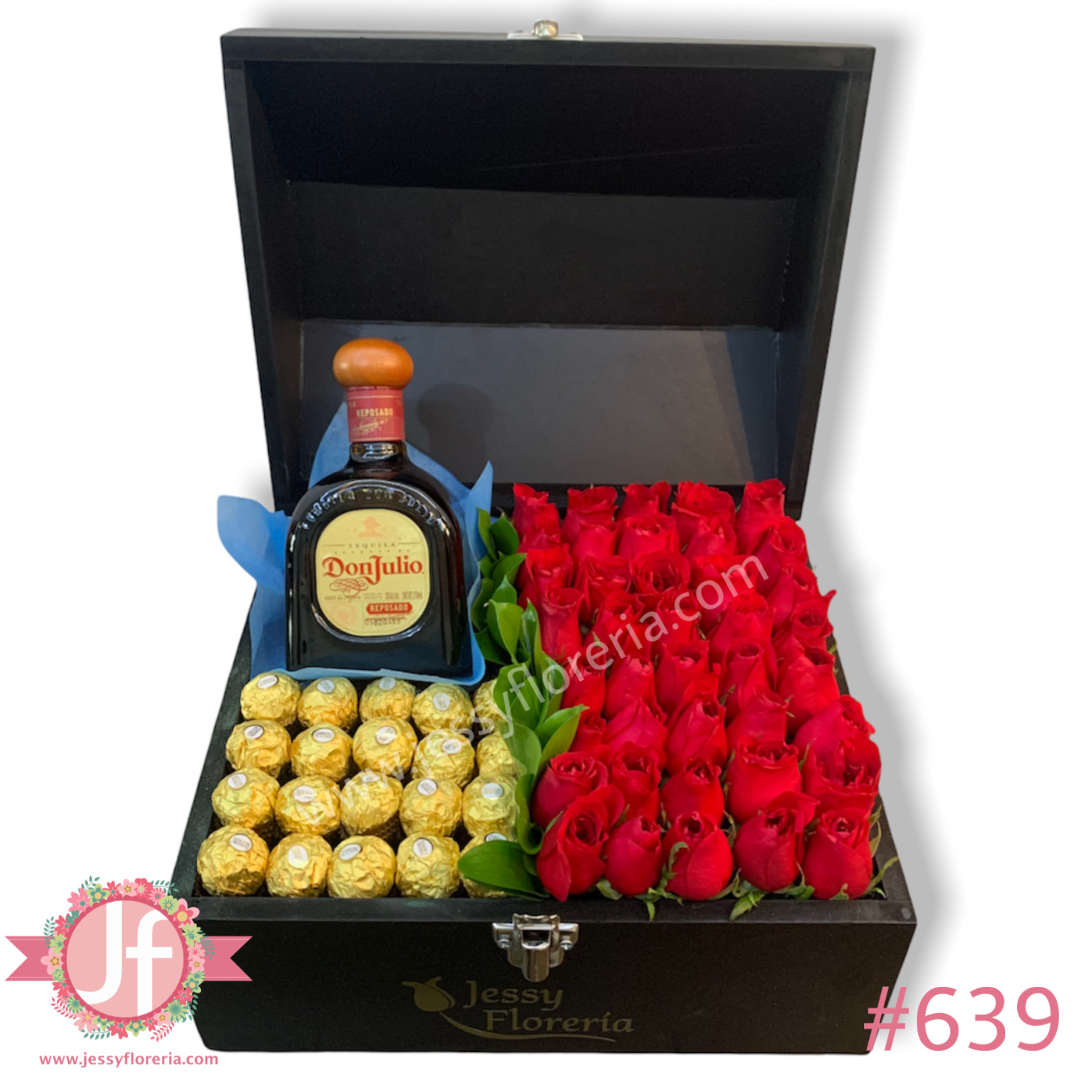 Cofre con 40 rosas, 20 ferreros y Don Julio reposado