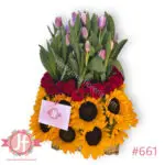 - Canasta 20 girasoles, 30 rosas y 30 tulipanes