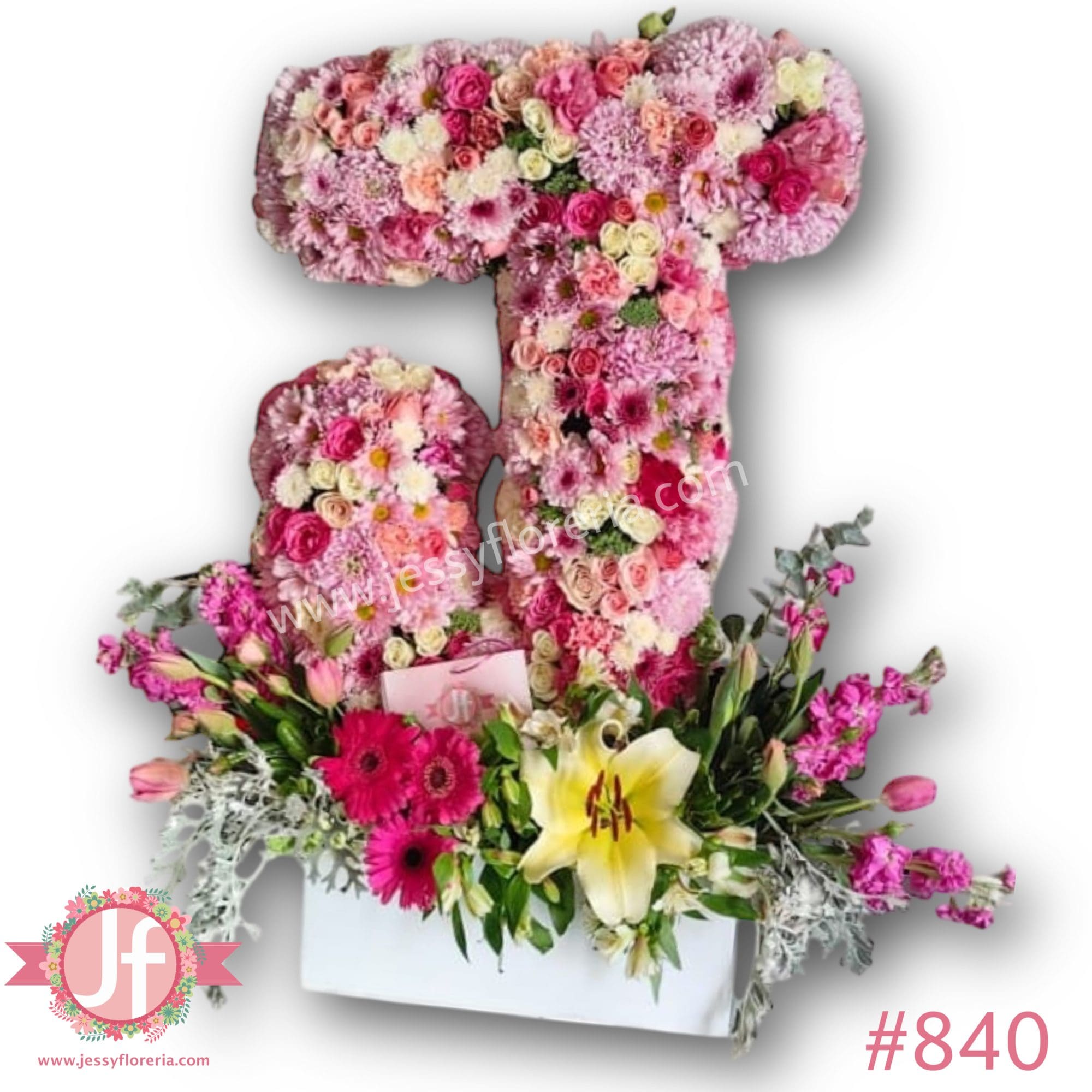 - Escultura en forma de letra J con rosas, lisianthus, encaje, rosa baby, clavel, roxana, margaritas, gerberas y concador