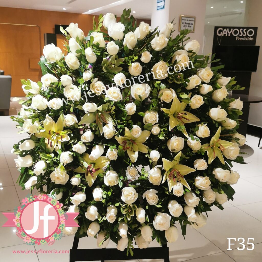 Sugerencia de mensaje para la Corona tripie 100 rosas y lilis: “Siempre en nuestra memoria.”