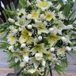 Sugerencia de mensaje para la Corona en tripie con rosas, lilis y concádor: “Siempre en nuestra memoria.”