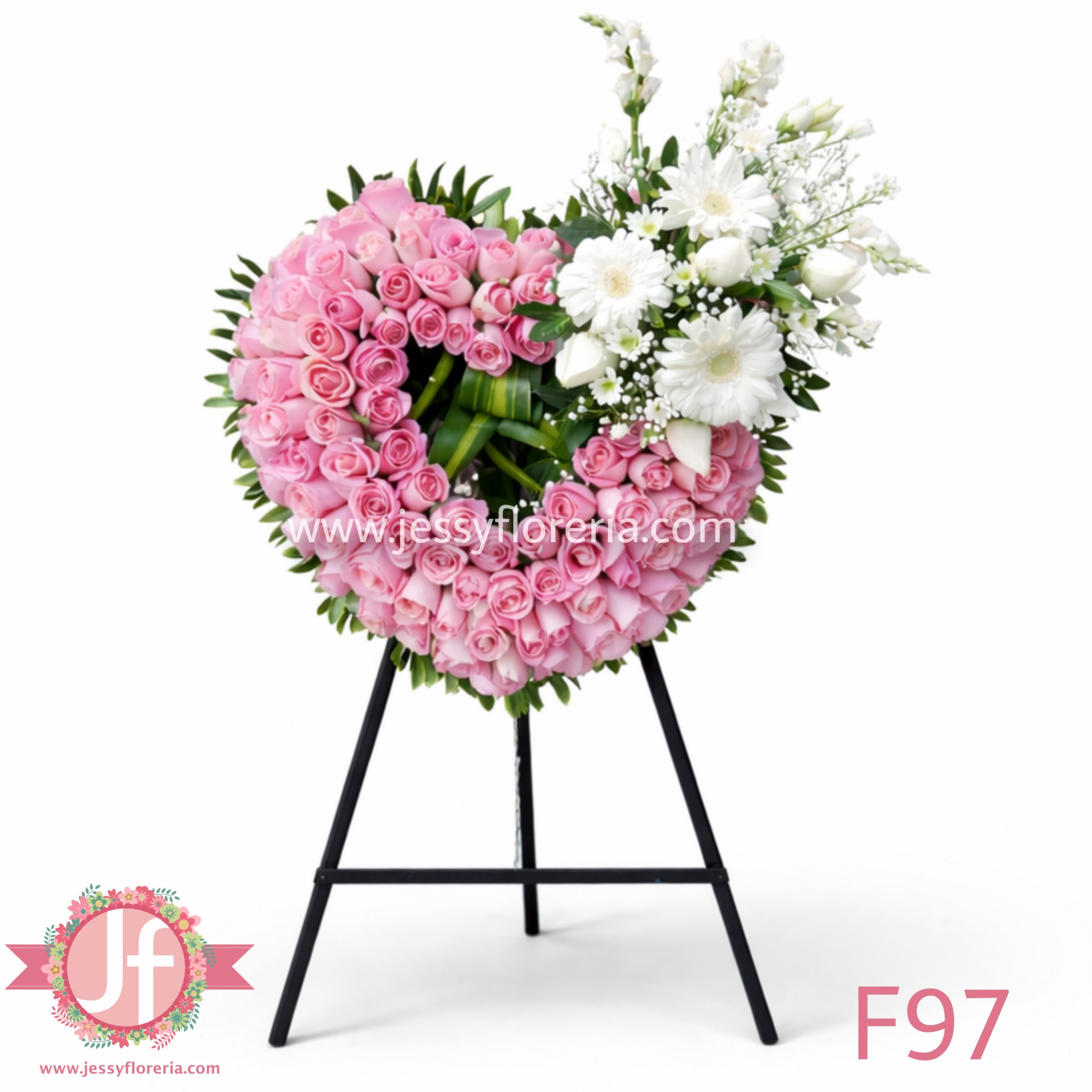 - Corona fúnebre en dorma de corazón con rosas rositas y flor surtida blanca