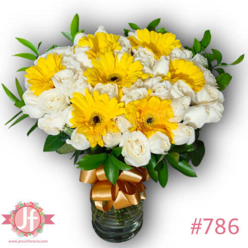 Florero 12 rosas blancas y 6 gerberas amarillas