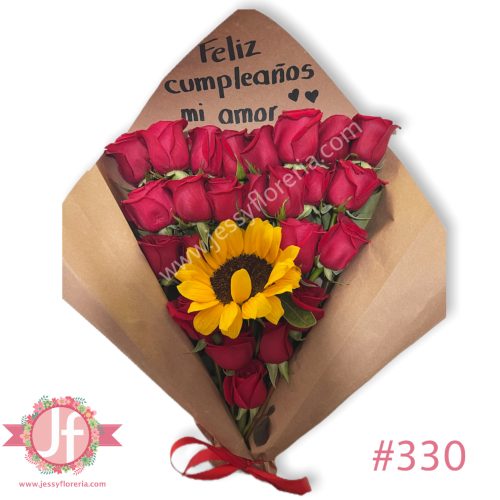 Ramo de 24 rosas y girasol