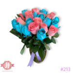Sugerencia de mensaje para Florero de 24 rosas rositas y azules: “Siempre te amare porque hiciste de cada momentos inolvidable, y cada vez que pensaba en ti yo sonreía”