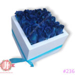 Sugerencia de mensaje para Caja con 25 rosas azules: “De todas las formas de amor, la más bella es la que transmite el corazón sin necesidad de una sola palabra”