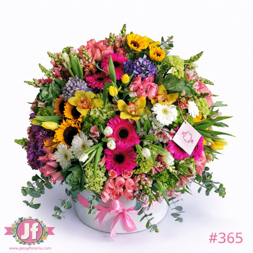 - Caja blanca circular con tulipanes, girasoles, gerberas, rosas y follajes