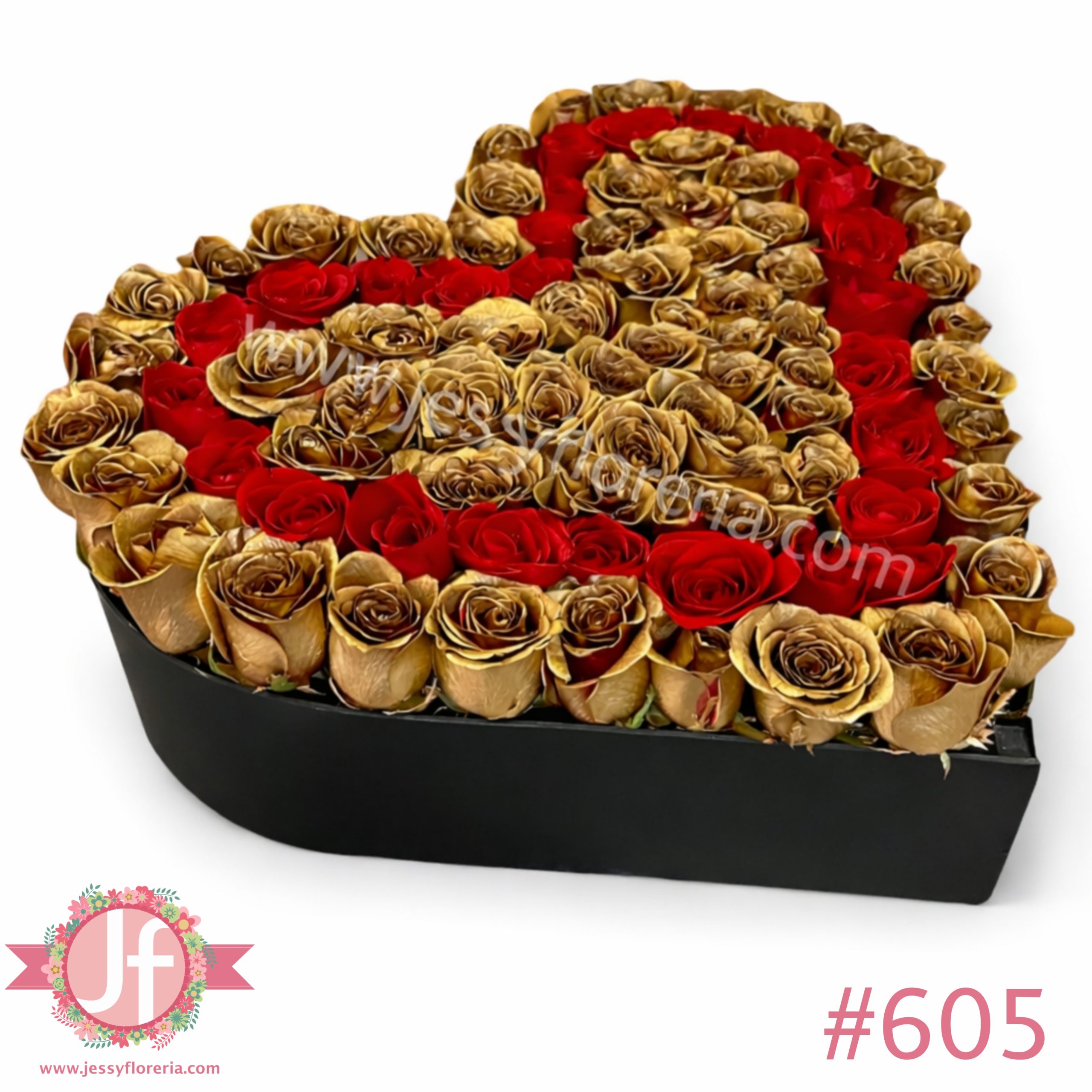 Consejos para el cuidado de tus flores – Caja negra corazón con rosas doradas y rojas