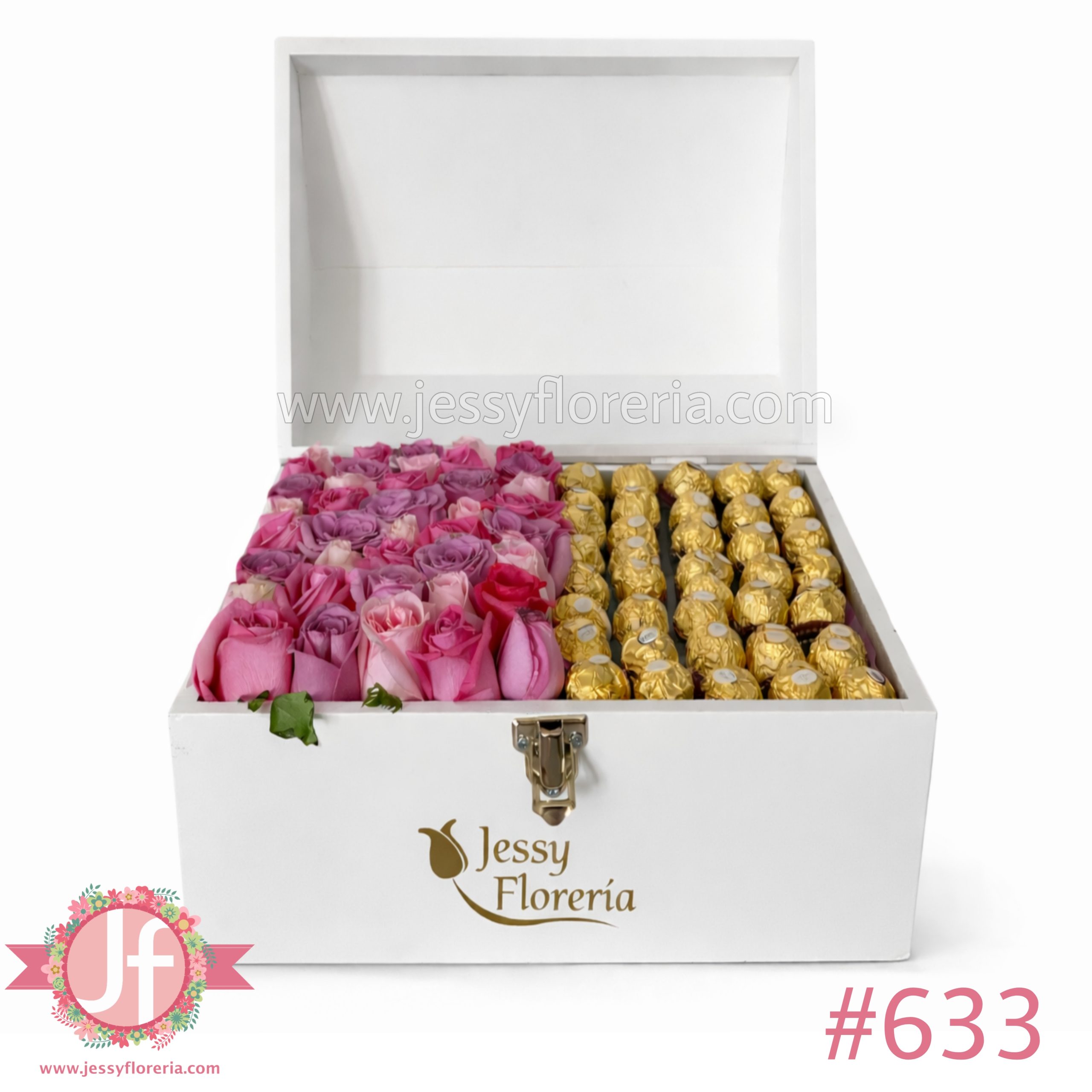 Cofre con 40 rosas rositas y 32 ferreros