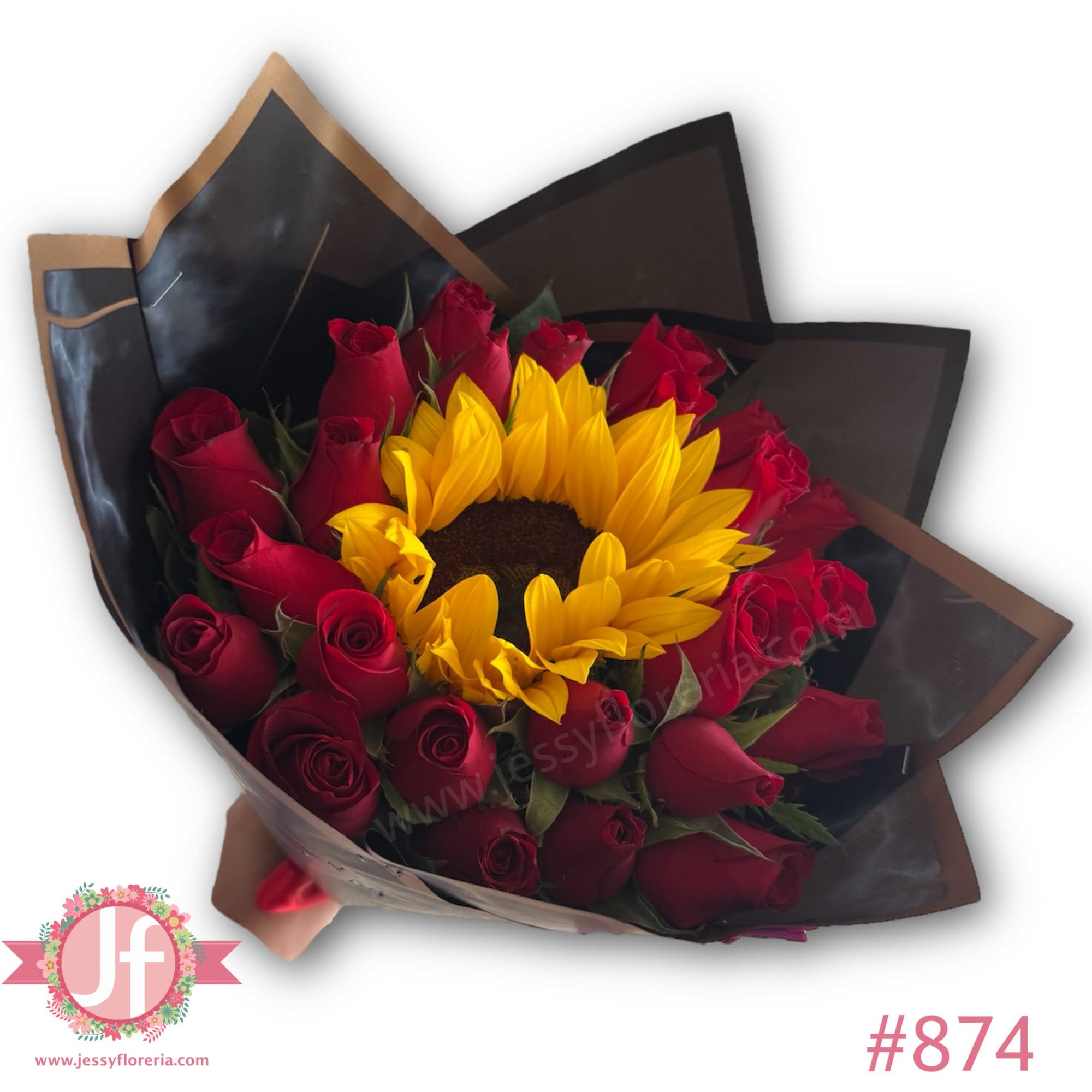 Sugerencia de mensaje para Bouquet 24 rosas y girasol : “Mi amor por ti crece con cada latido de mi corazón.”