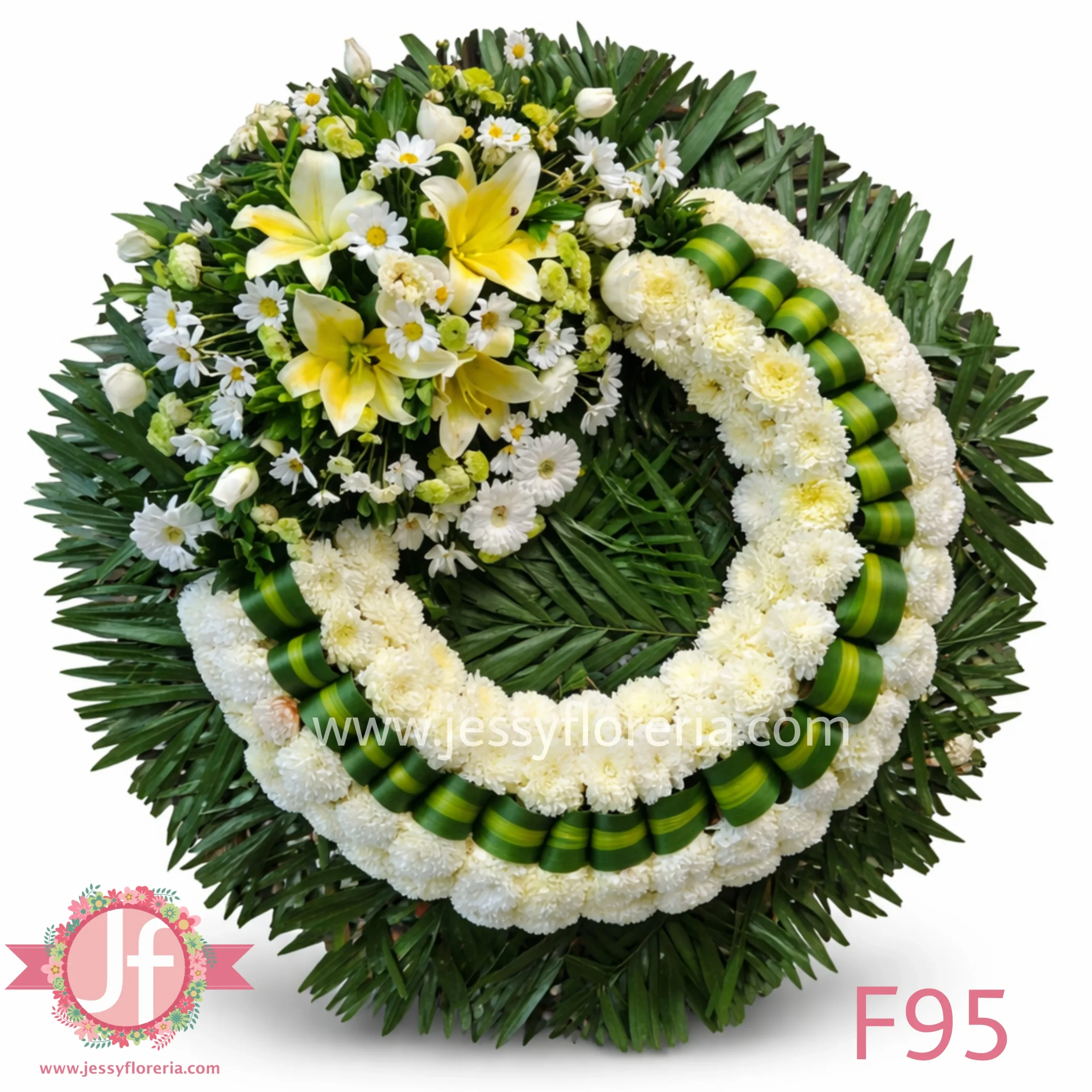 - Crorona con rosas blancas, concador, crisantemo, margarita y follajes