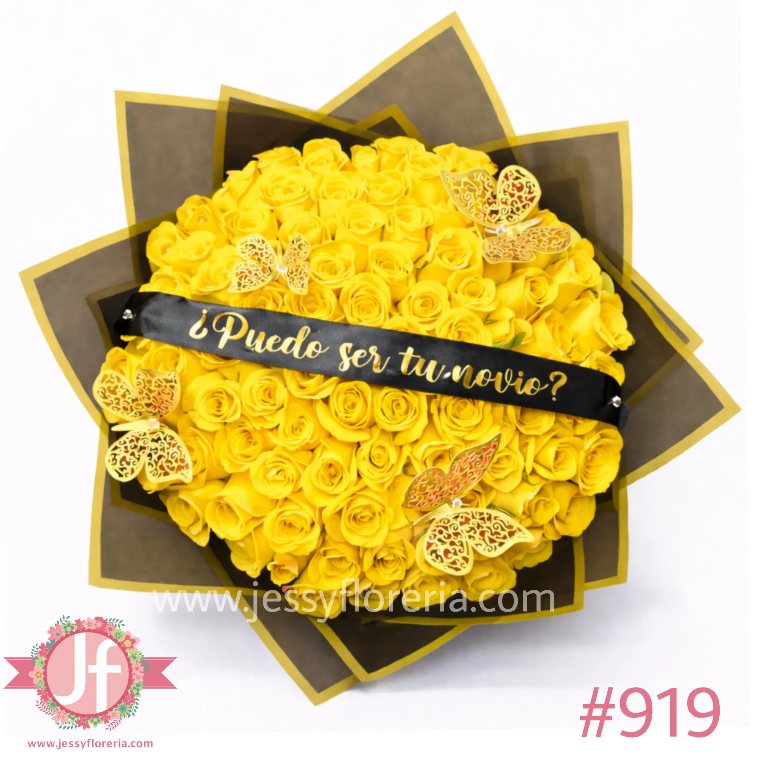Ramo 100 rosas amarillas, liston y mariposas